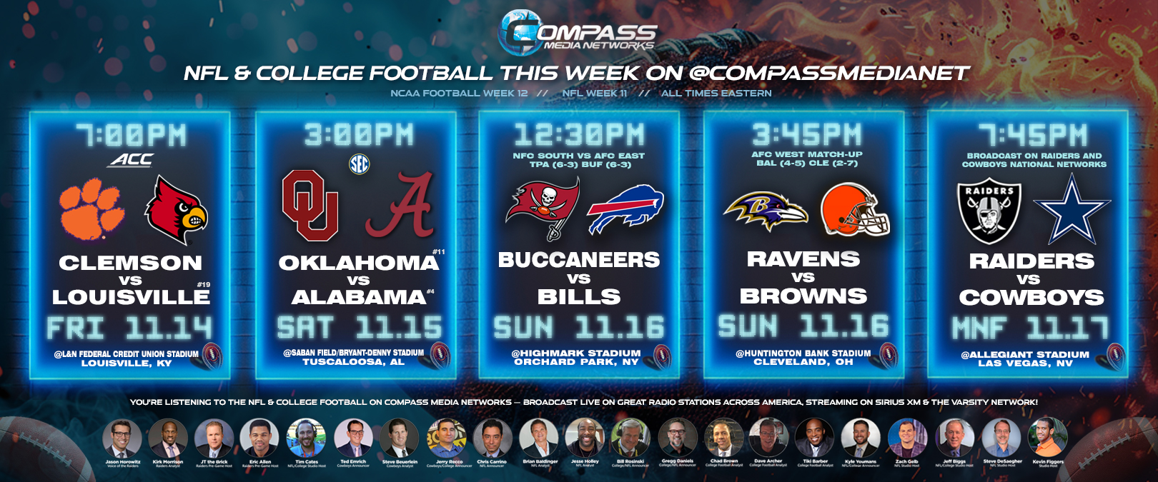 Compass Media Networks is the exclusive broadcaster for the Las Vegas Raiders and official broadcaster of the Dallas Cowboys along with play-by-play broadcaster for select NFL Sunday Afternoon games, College Football and Basketball match-ups.