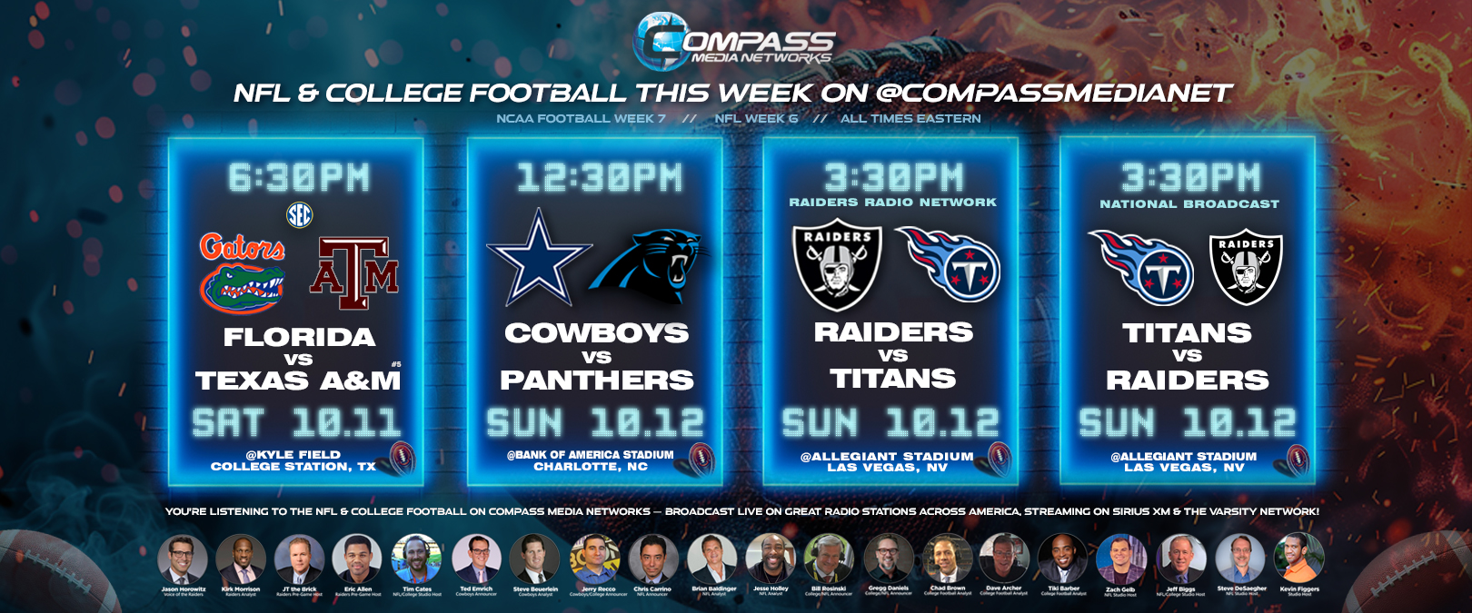WELCOME TO THE 2025 NFL & NCAA FOOTBALL AND 2026 NCAA BASKETBALL SEASON! Compass Media Networks is the exclusive broadcaster for the Las Vegas Raiders and official broadcaster of the Dallas Cowboys along with play-by-play broadcaster for select NFL Sunday Afternoon games, College Football and Basketball match-ups.